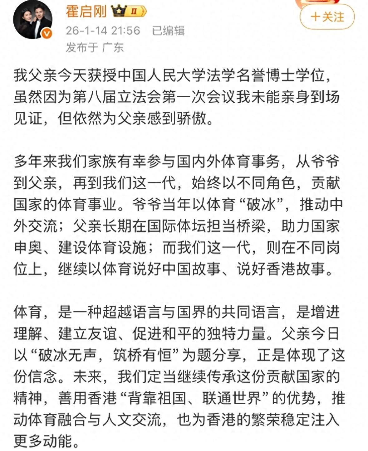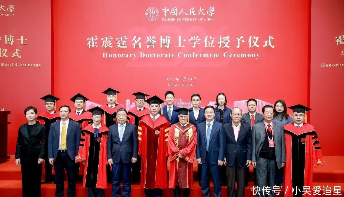 2026年1月,霍震霆在人大礼堂接过名 誉博士证。发言主题是“破冰无声,筑桥有恒”,说这是对自己几十年“体育搭桥”的肯定。